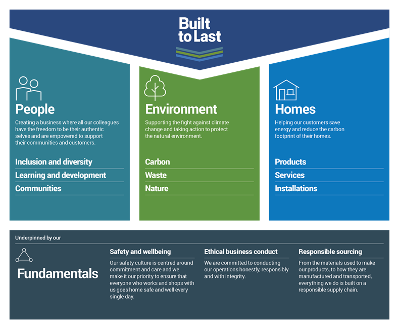 Our strategy has three core pillars: People, Environment and Homes which cover the sustainability topics where we can create most impact. These are underpinned by our Foundations: the sustainability topics we measure and manage to ensure we continue to operate responsibly through our business and supply chain activities.